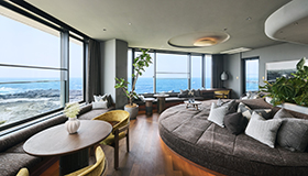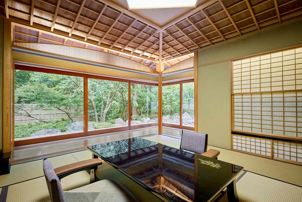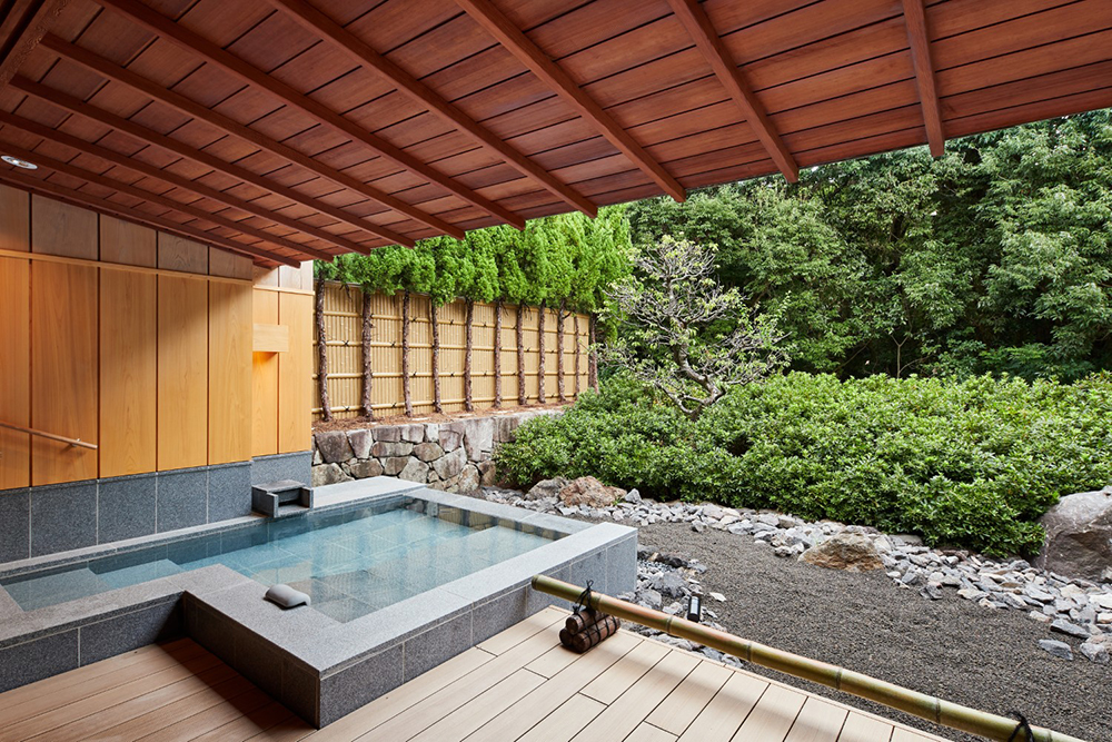 澄み渡る海と大自然に囲まれた「赤沢迎賓館」は、静謐な空間でプライベートな宿泊が愉しめる上質な宿です。1,000坪を超える広大な敷地の中に、日本建築の伝統美と匠の技が織り成す洗練された空間が佇みます。網代編みの天井や聚楽の塗り壁など、厳選された意匠と上質な素材が生み出す優雅な設え。また、全15室すべての客室には露天風呂を備えており、日本庭園や自然を目の前に木々のゆらぎを感じながら、プライベートな湯浴みをお愉しみいただけます。大浴場では、深緑が心地よい自然に溶け込むような湯浴みをお愉しみいただくことができます。湯には、伊豆の水深800mから汲み上げた海洋深層水を用いております。ミネラル成分を豊富に含んでおり、やわらかな湯あたりと、肌をしっとり優しく包み込む心地よさをご体感いただけます。美しい日本庭園や自然を望み、重厚な趣の中に身をゆだね、穏やかな時間の流れをご体感ください。