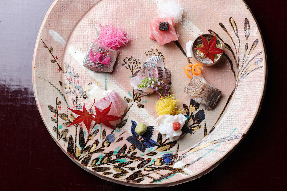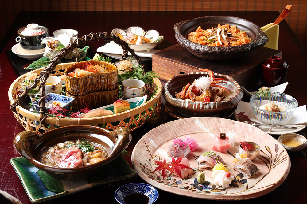 赤沢迎賓館のお料理は、伊豆の海が育む海鮮や地産の厳選素材を使用し、四季折々の味覚をお愉しみいただけます。美しい器に彩られた品々は、移ろう季節の気配とともに日本の恵みを感じられるようご用意いたしました。特に、新鮮な魚介類を味わうお料理では、旬の恵みが持つ豊かな旨味と繊細な余韻を存分にご堪能いただけるよう仕立てております。庭園を望む席を中心に、全室個室の落ち着いた空間で、贅を尽くしたひとときをお過ごしください。
