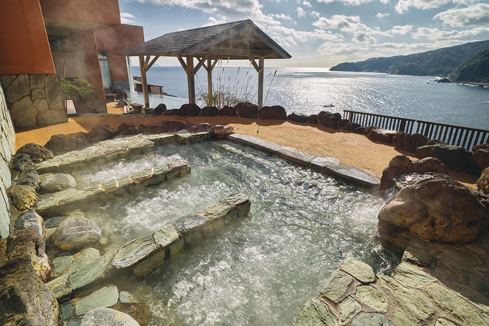 海と緑に包まれた絶好のロケーションに位置する「赤沢日帰り温泉館」。空と海と湯船が一体に見える大露天風呂では、開放感あふれる眺望を楽しみながら、日常を忘れて心身をゆるめる時間を過ごせます。また、タイ古式マッサージ、新鮮な海の幸を味わうお食事処なども充実しており、贅沢なひとときをお楽しみいただけます。