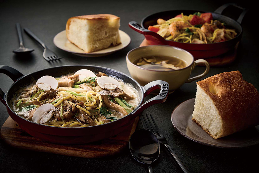 昼の「ASOBuono!」は、高火力で仕上げる焼きパスタ専門店。地産食材を使った焼きパスタは、生パスタを熱々の鉄板で焼き上げることでソースがしっかりからみ、香ばしさとコクが際立ちます。手作りのフォカッチャやスープなど、満足感のあるランチをお楽しみいただけます。