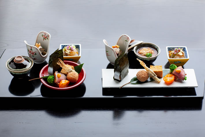 ラグジュアリースイートにお泊まりのお客さまのお食事は、水盤に浮かぶウォーターバルコニーでご用意。近海で獲れる新鮮な魚介類や日本各地の旬の食材を中心とした日本料理を、この非日常な空間でお召し上がりください。